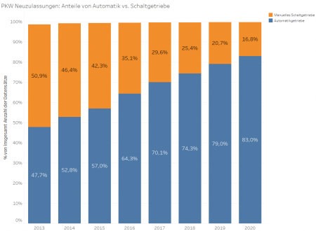 Un coup d´oeil sur l´évolution des nouvelles immatriculations depuis 2013 montre une image claire: les voitures à transmission automatique sont de plus en plus prisées. Au cours de l’année passée, 83% des voitures nouvellement immatriculées étaient équipées d’une transmission automatique. Sept ans plus tôt, c´est la boîte de vitesses manuelle qui récoltait la faveur des automobilistes avec environ 51% de part de marché. Qu´en dire? Sommes-nous devenus paresseux et avons nous relégué la boîte de vitesse manuelle au passé? Comment cela se traduit en termes de valeurs résiduelles?