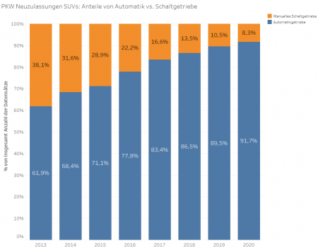 En parallèle, il y a une tendance à ne clairement pas négliger: le boom des SUV. Ceux-ci ont toujours été principalement équipés de transmissions automatiques. Déjà en 2013, seulement 38% des voitures de ce segment disposaient de boîtes de vitesses manuelles, alors que ce n’est plus que 8% désormais (Fig. 2).