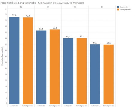 C´est sur un segment plutôt exotique que l´on consate des différences de valeurs résiduelles. En effet, pour les cabriolets et les roadsters, les transmissions manuelles atteignent des valeurs résiduelles en moyenne légèrement plus élevées, avec une différence de l´ordre de 2% à 3% par rapport aux transmissions automatiques (Fig. 5). C’est aussi ce segment qui n’a suivi que partiellement la tendance en faveur des boîtes auto: avec un quart à un tiers de toutes les nouvelles immatriculations, la part des boîtes manuelles pour ce type de voiture est relativement stable depuis 5 ans.